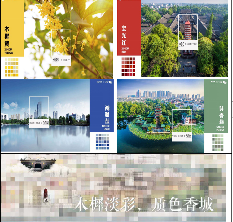 項目團隊運用色彩學的調研分析方法,通過溯文脈、理現(xiàn)狀、推主色、定旋律、落應用對新都進行梳理,通過尋找能夠體現(xiàn)新都區(qū)歷史文化傳統(tǒng)和自然色彩基因的城市色彩特征,尋找匹配新都區(qū)光環(huán)境、自然環(huán)境、人文環(huán)境及傳統(tǒng)建筑的城市色彩特征,最終選定以成都天府黃色系為延續(xù),來源于新都明朝狀元楊升庵“寶書林中碧玉涼·秋風又送木樨黃”詩句中的“木樨黃”作為新都區(qū)城市色彩特征色主色,以新都歷史建筑的“寶光紅”,新都城市發(fā)展的“新都藍”,桂湖森林基底的“荷香綠”為特征色色系,并根據新都的人文歷史、地理特征、城市發(fā)展確定城市色彩基調“木樨淡彩,質色香城”。