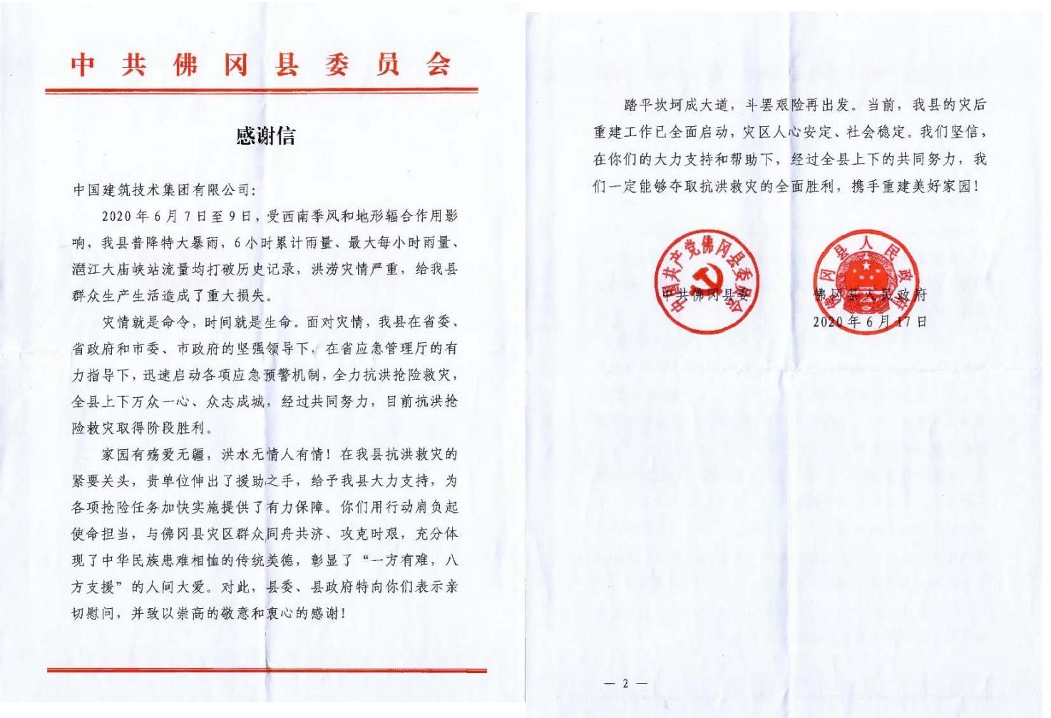 6月17日、6月23日第六工程分公司清遠(yuǎn)恒大御泉四季花園總承包項(xiàng)目部及第六工程分公司黨支部接連收到了清遠(yuǎn)市中共佛岡縣委、佛岡縣人民政府、中共洛洞村總支部委員會(huì)的感謝信,感謝信內(nèi)容主要是針對(duì)中技集團(tuán)清遠(yuǎn)恒大御泉四季花園總承包項(xiàng)目部及第六工程分公司黨支部在6月7日至6月9日清遠(yuǎn)市佛岡縣發(fā)生的50年一遇的洪災(zāi)中做出的巨大貢獻(xiàn)表示真誠(chéng)的感謝。?