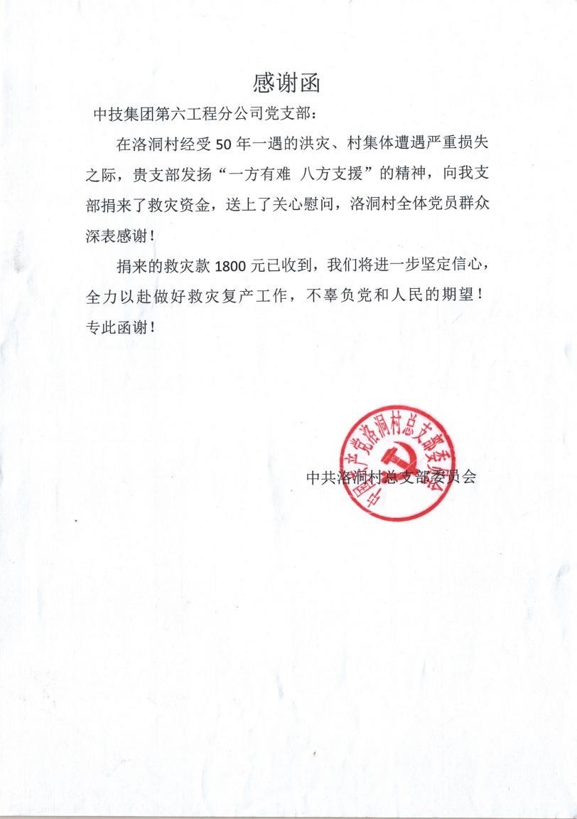 災(zāi)區(qū)黨委及政府為感謝我司及六分黨支部在災(zāi)情中的巨大貢獻(xiàn)特致感謝信,高度贊許我們“用行動(dòng)肩負(fù)起使命擔(dān)當(dāng)”,表達(dá)了對(duì)我司“一方有難,八方支援”幫助受災(zāi)的湯塘同胞度過(guò)難關(guān)的感激情懷,同時(shí)對(duì)我司和六分黨支部組織的“情系湯塘,搶險(xiǎn)救災(zāi),愛(ài)心捐贈(zèng)”活動(dòng)以及為災(zāi)區(qū)所捐的物資和款項(xiàng)表示由衷的感謝!