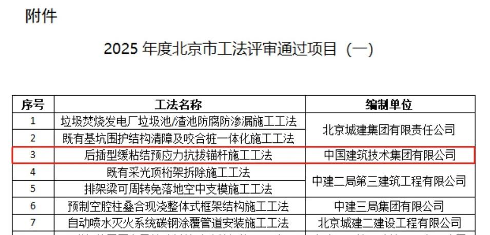 近日,由中國建技申報的“后插型緩粘結(jié)預應力抗拔錨桿施工工法”通過了北京市住房和城鄉(xiāng)建設委員會組織的北京市工法專家評審,這一成果標志著中國建技在技術創(chuàng)新、施工質(zhì)量和項目管理等方面實現(xiàn)了新的突破。