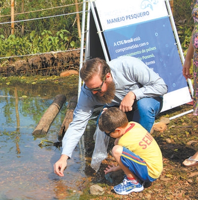在位于巴西圣保羅州的伊利亞電站附近,三峽巴西員工帶領(lǐng)電站周邊社區(qū)孩子一起放流魚苗,并講解相關(guān)知識(shí)。三峽巴西供圖