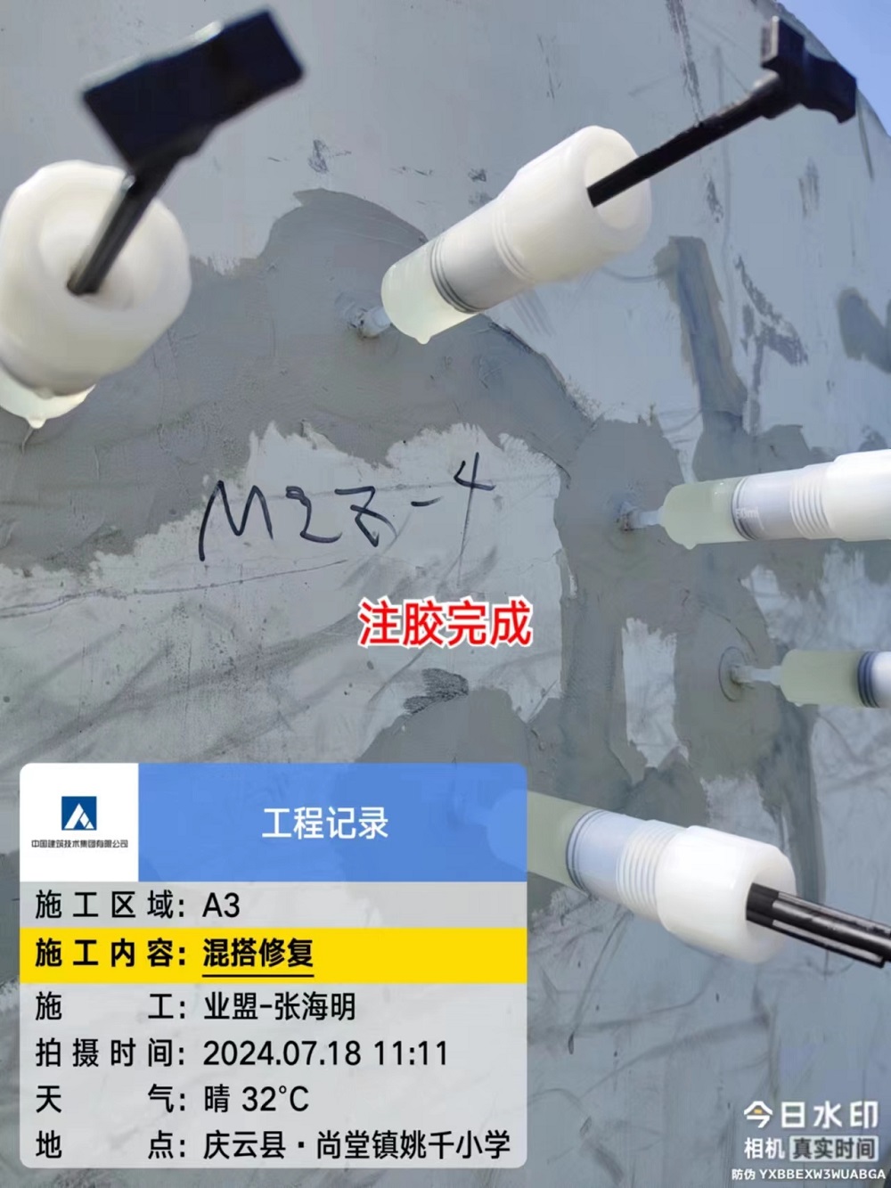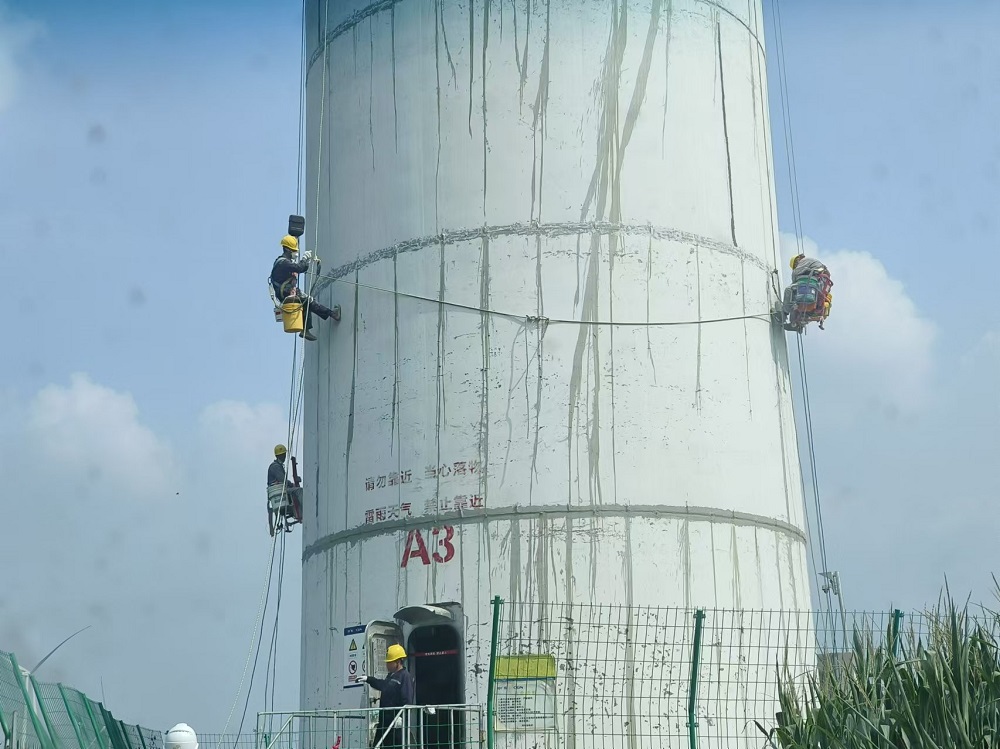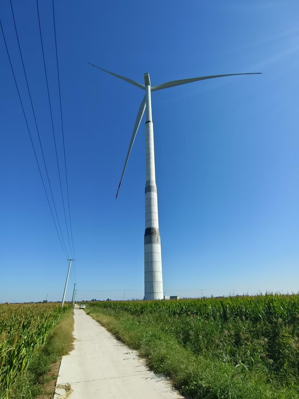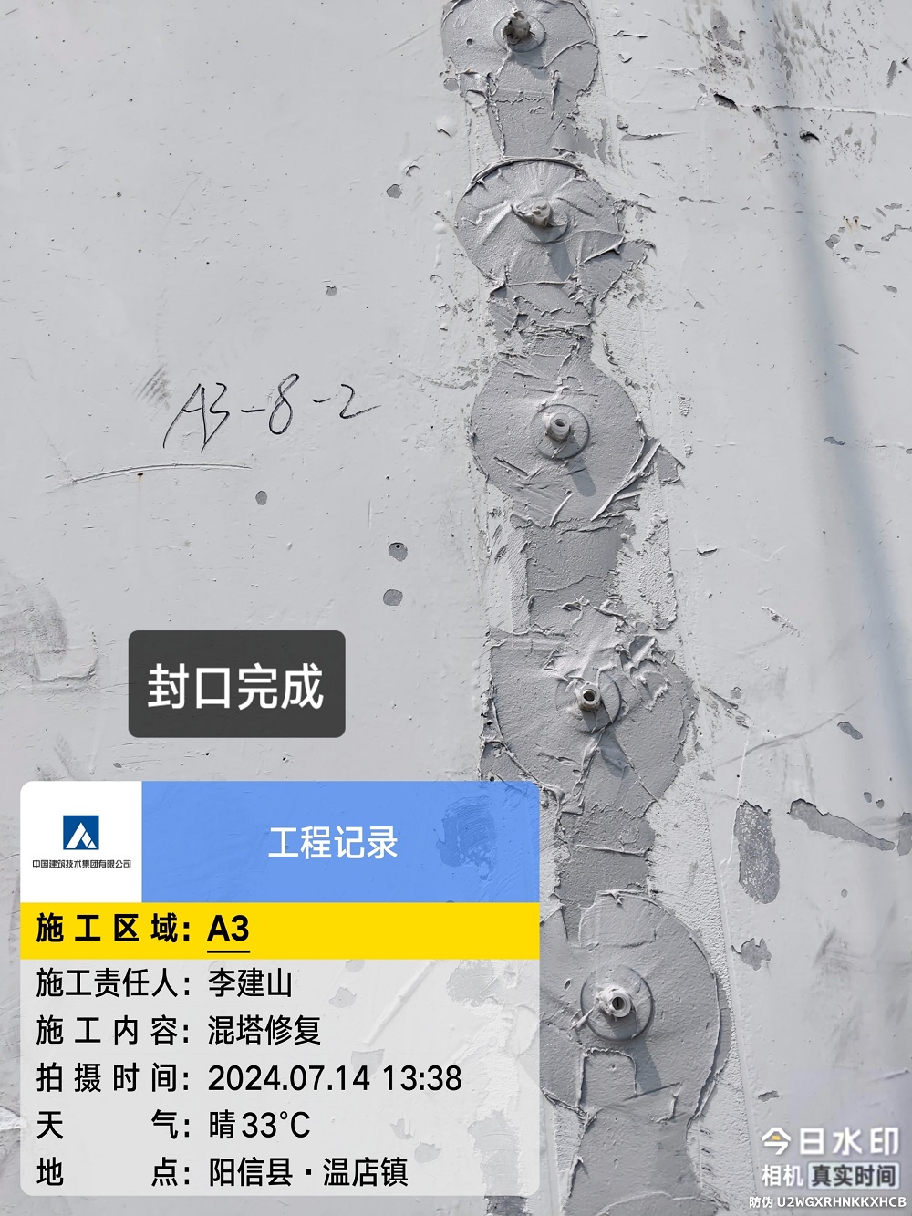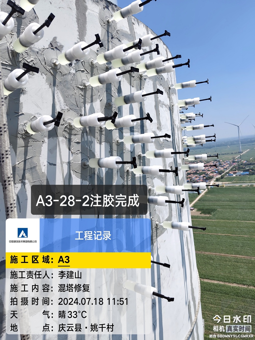 山東省德州市的中廣核慶云尚堂風(fēng)電場位于山東省德州市慶云縣尚堂鎮(zhèn)。WD195-5000型風(fēng)電機(jī)組,混凝土部分為預(yù)制裝配式結(jié)構(gòu),混塔總高110.03m,共28層。M01~M26高3.99m,M27高3.60m,M28高2.4m。M01~M07外徑7800mm,M09~M14外徑6600mm,M16~M28外徑5400mm,M08、M15為過度節(jié)段。除門洞位置外,M01管片壁厚為300mm,M02~M27管片底部壁厚300mm,M28管片底部壁厚1050mm。M01~M15各由兩個(gè)C型管片組成,通過豎縫插筋連接并灌漿,組成完整O型管片。管片M16~M28為完整的預(yù)制O型管片。我單位需對塔筒節(jié)間縫隙重新補(bǔ)膠,并對個(gè)別塔進(jìn)行空鼓、掉塊及裂縫進(jìn)行修復(fù)。