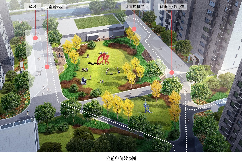 利用宅前消防登高場地規(guī)劃打球、健走、騎行和兒童照料等內容,將宅前空間作為單元住戶的交往活力場所?;顒訄龅赝鈹U,結合綠化布置休閑座椅、花池廊架和文化藝術裝置,合理布局自行車棚、信報箱、垃圾收集箱和配電室等項設施。單元樓門設置入口標識和門禁,居民活動也能對樓宇安全發(fā)揮良好的監(jiān)控作用。