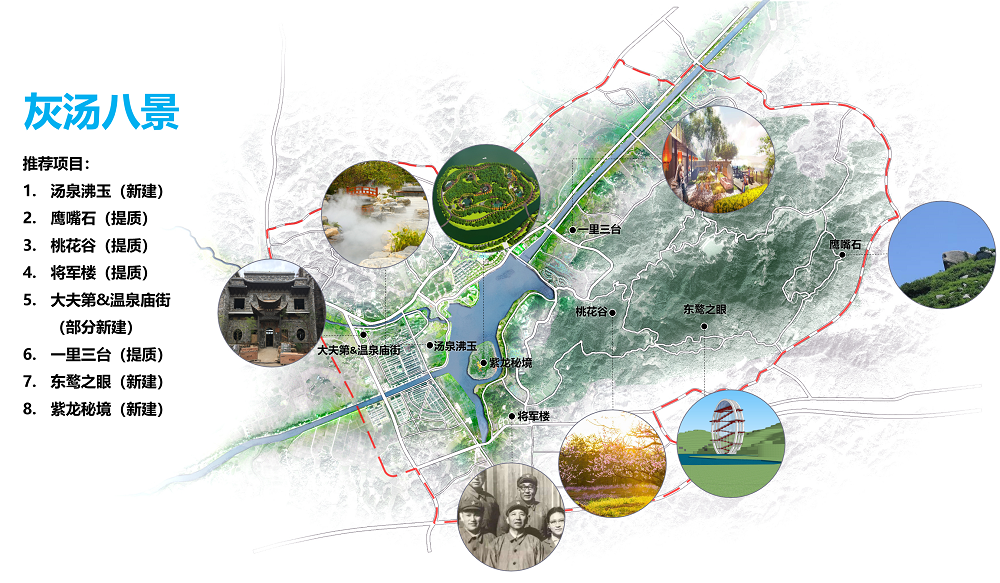 規(guī)劃形成“兩公園一小鎮(zhèn)、八景點(diǎn)一通廊”的空間結(jié)構(gòu),以紫龍湖為核心打造溫泉康養(yǎng)文化公園;結(jié)合東鶩山打造山地體育公園;結(jié)合灰湯鎮(zhèn)區(qū)打造灰湯溫泉民俗小鎮(zhèn);打“湯泉沸玉、鷹嘴石、桃花谷、將軍樓、大夫第&溫泉廟街、一里三臺、東鶩之眼、紫龍秘境”灰湯八景;依托烏江、紫龍湖、東鶩山形成山水景觀視線通廊。