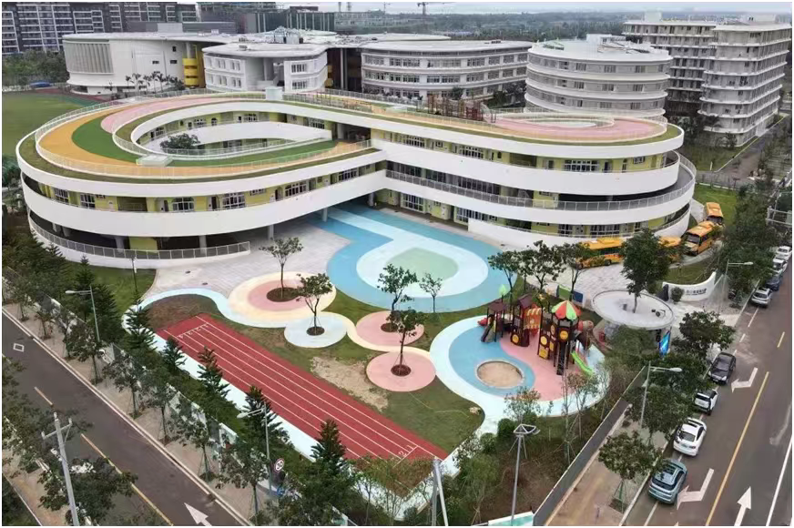學校秉承國際化設計理念,集智慧化學習空間、舒適性生活空間、多層次活動空間于一體,涵蓋高級中學與幼兒園,配套建設多功能體育設備和開放式場館、“高顏值”教室、圖書館、多功能禮堂等9棟單體建筑,打造出友好的學習氛圍、智能化起居環(huán)境、營造了精彩的生活社區(qū)。可供1728個高中學位與450名幼兒學童。
