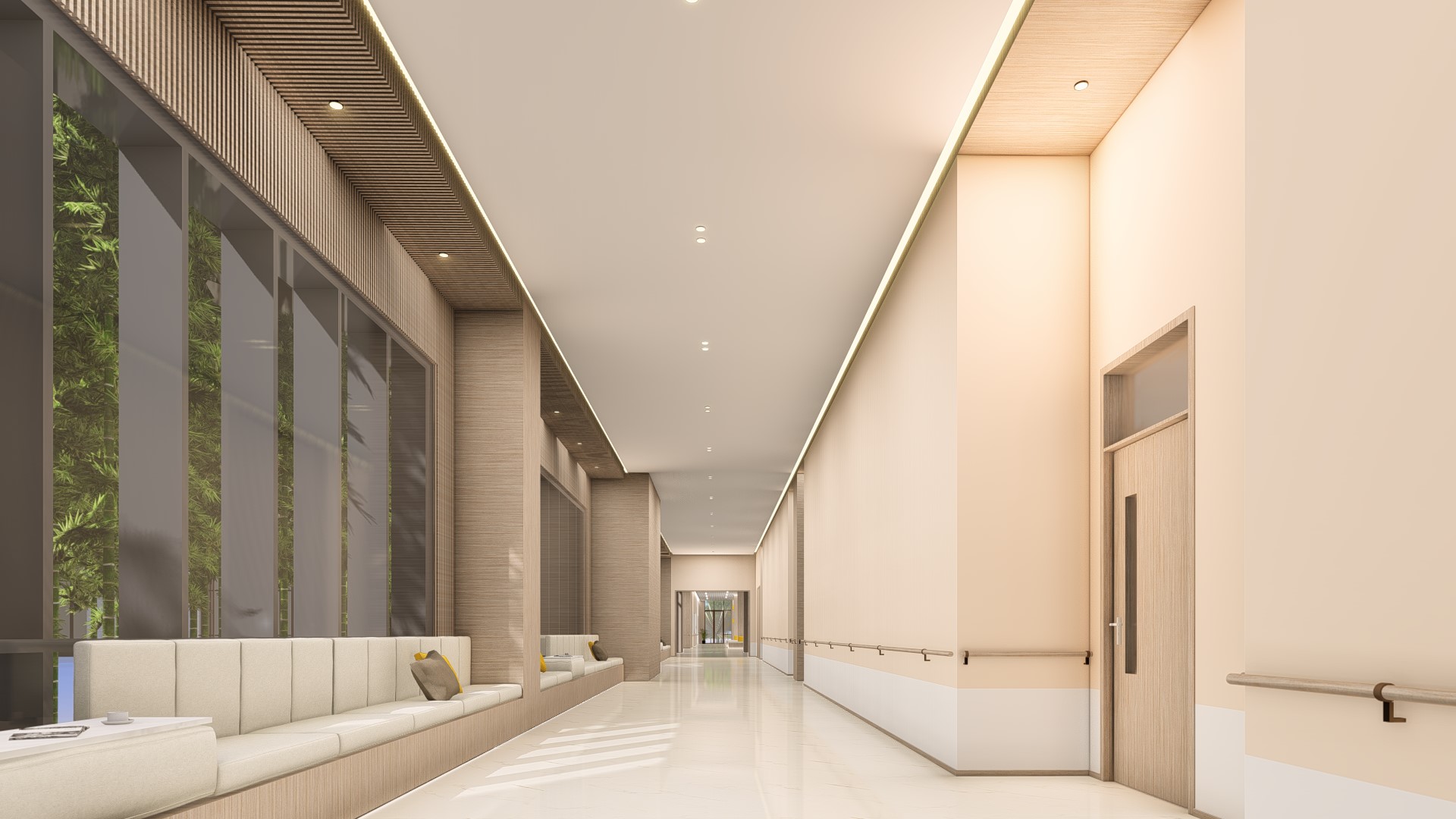 本項(xiàng)目以傳統(tǒng)空間的“院”為切入點(diǎn),兩個(gè)功能主體通過高低不同的體量聚落成三個(gè)層級(jí)的院落空間,通過連續(xù)起伏的坡屋頂融通勾連,以喚醒老人心中留存的空間記憶。