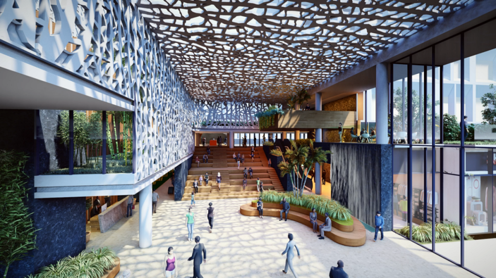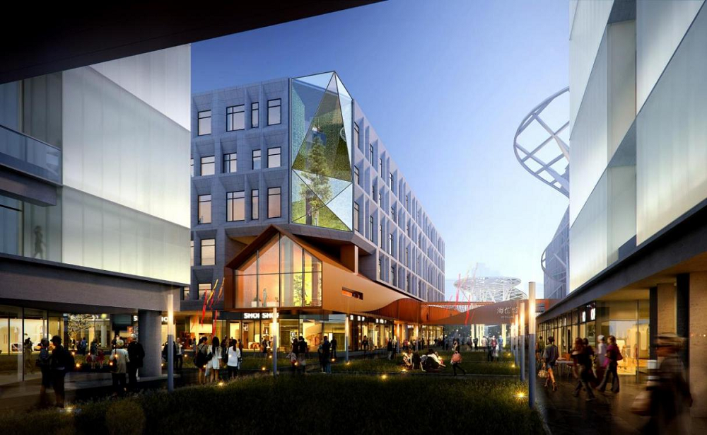 針對(duì)項(xiàng)目的所處區(qū)域環(huán)境、既有建筑群空間與土建現(xiàn)狀等現(xiàn)實(shí)挑戰(zhàn),規(guī)劃設(shè)計(jì)提出打造集住宿、工作、社交、休閑于一體的商務(wù)生態(tài)閉環(huán)策略。通過(guò)連通首層商業(yè)東線、塑造小鎮(zhèn)中心、加建空中連廊、改建局部空間等方式,將首層商業(yè)社區(qū)、二層酒店社區(qū)與上層商務(wù)辦公社區(qū)多業(yè)態(tài)由平面復(fù)合街區(qū)轉(zhuǎn)向?yàn)榱Ⅲw復(fù)合街區(qū),以構(gòu)建更具溫度感的生活情景,加強(qiáng)侵入式的極致體驗(yàn),提升服務(wù)資源的共享品質(zhì),創(chuàng)造多樣化的空間視點(diǎn),引發(fā)不同視角下對(duì)生活的獨(dú)特感悟。